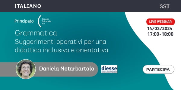 La registrazione del webinar del 14 marzo “Grammatica: Suggerimenti operativi per una didattica inclusiva e orientativa” è disponibile qui.